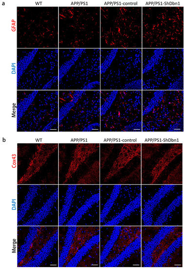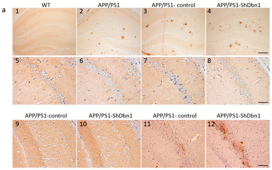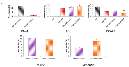 To explore the impact of down-regulated Dbn1 in AD mice, Aβ and GFAP in the hippocampus were detected by immunohistochemical or immunofluorescence staining (Figure 6a and Figure 7a). Aβ plaque was a typical pathological change in the AD brain. In addition, GFAP was a specific marker of astrocytes to assess the homeostasis, inflammation, and nutrition of the brain [19,20,21]. The area fraction data showed that Aβ and GFAP expression in APP/PS1-ShDbn1 was higher than in APP/PS1-control mice, though no statistically significant difference was found (Figure 6b and Figure 8b). GFAP in injection mice (APP/PS1-control and APP/PS1-ShDbn1) was significantly greater than AD mice without injection (p < 0.01, Figure 8b). The area fraction of Aβ in APP/PS1-ShDbn1 mice (0.52 ± 0.04) was more than that of the APP/PS1-control group (0.46 ± 0.03, p = 0.24, p > 0.05, Figure 6b). In addition, the area fraction of GFAP in the APP/PS1-ShDbn1 (4.95 ± 0.18) mice was higher than the in the APP/PS1-control group (4.72 ± 0.15, p = 0.33, p > 0.05, Figure 8b). The data imply that a lack of Dbn may promote production of Aβ and activation of astrocytes and then aggravate lesions associated with AD.