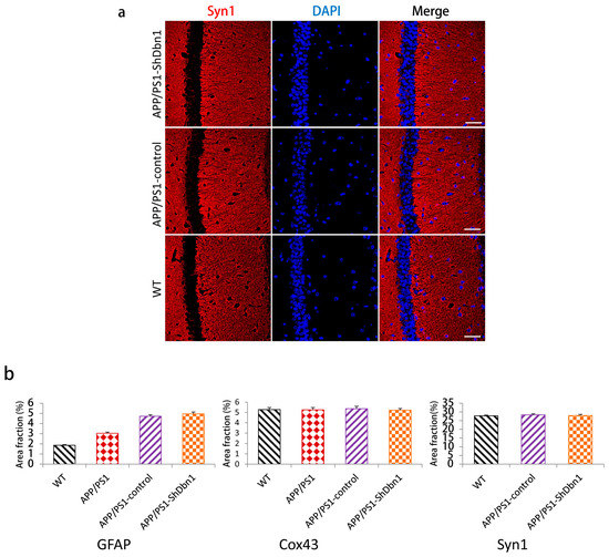 For further study of changes in Dbn relative protein in mice hippocampus, postsynaptic density-95 (PSD-95), microtubule-associated protein 2 (MAP2), vimentin, connexin43 (Cox43), and synapsin1 (Syn1) were detected by immunohistochemical or immunofluorescence methods. PSD95 is a marked protein, which can combine with Dbn to maintain memory activity in neuronal dendritic spines [8]. Compared with WT mice, the area fraction of PSD-95 in all AD mice was significantly decreased. PSD-95 in the APP/PS1-ShDbn1 mice was noticeably lower than in APP/PS1-control mice (p < 0.01, Figure 6a,b). The results imply that lack of Dbn may impact PSD-95 expression in the hippocampus. MAP2, a marker protein, was found specifically in dendritic branches of the neuron. Though there was no significant difference between the APP/PS1-control and the APP/PS1-ShDbn1 mice, the area fraction of MAP2 in APP/PS1-control mice (12.46 ± 0.73) was higher than that in APP/PS1-ShDbn1 mice (11.41 ± 0.49). Vimentin, an intermediate filament (IF) protein, plays important roles in cytoskeletal constitution and cell signal transduction [22,23]. In this study, vimentin was found in the hippocampus of APP/PS1-ShDbn1 mice markedly more than in APP/PS1-control mice (p < 0.05, Figure 6a). This implies that down-regulated Dbn may impact vimentin greatly. Cox43, a highly expressed connexin widely spread throughout brain tissue, can interact with Dbn [24,25,26]. Synaptic associated protein Syn1 performed various functions in synapse formation, vesicle trafficking, and neurotransmitter release and was found decreased in the AD brain [27]. This study investigated the expression level of the two proteins by immunofluorescence staining. However, there were no significant differences in Cox43 and Syn1 levels between the APP/PS1-ShDbn1 and APP/PS1-control mice (p > 0.05, Figure 7b and Figure 8). The data imply that decreased Dbn has no noticeable impact in these two proteins.