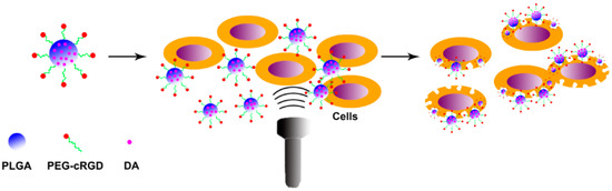 Ultrasound (US) is widely applied as an imaging modality, resulting from its real time applications, low cost, simplicity, and safety. More recently, studies revealed that US can facilitate local drug and gene delivery, and the encapsulated drug release could be triggered and controlled by US [25,26,27,28,29]. The mechanisms through which US enhances drug and gene delivery can be summarized as direct changes in the drug or vehicle, increasing bioavailability or enhancing efficacy, direct changes in the biological or physiological properties of tissues, facilitating transport, and indirect effects through which US acts on the vehicle to produce changes in the surrounding tissue [30,31,32]. However, there are a few reports of application of US for the treatment of atherosclerosis. In this work (Figure 1), the optimization of nanoparticles combined with US has been determined using an orthogonal design. We then experimentally investigated cellular uptake of the in vitro delivery of US-triggered drug delivery of DA-PLGA-PEG-cRGD nanoparticles (NPs) using confocal microscopy and a flow cytometer. Finally, the therapeutic effect of targeted DA-PLGA-PEG-cRGD NPs combined with US for human umbilical vein endothelial cells (HUVECs) damaged by oxidized low-density lipoprotein (ox-LDL) was evaluated based on cell viability.