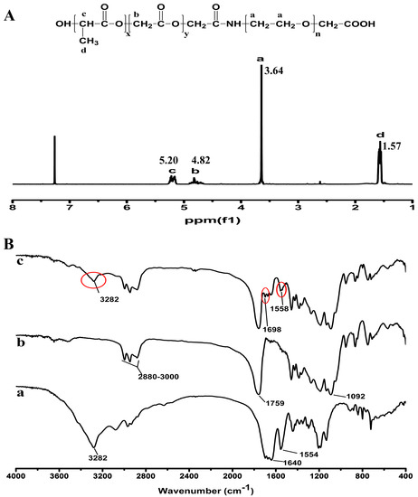The chemical structure of PLGA-PEG-cRGD was confirmed by nuclear magnetic resonance (NMR) spectroscopy. In addition, the 1H NMR spectrum was measured in deuterated chloroform using a Bruker Avance 400 (400 MHz) spectrometer (Beijing, China). FTIR was measured using a Nicolet NEXUS-670 Fourier Transform Infrared Spectrometer (Madison, WI, USA).