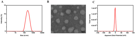 The particle size, PDI and zeta potential of the DA-PLGA-PEG-cRGD NPs were determined by DLS (Malvern Zetasizer nano ZS, Malvern, UK) measurements. Phosphate-Buffered Saline (135 mM NaCl, 4.7 mM KCl, 10 mM Na2HPO4, 2 mM NaH2PO4, pH = 7.4) was used to acquire the particle size, PDI and zeta potential of the DA-PLGA-PEG-cRGD NPs. In order to observe the morphology of the nanoparticles, TEM images were obtained by H-800 transmission electron microscopy (Hitachi, Tokyo, Japan). The procedure for staining was as follows: the nanoparticle solution was first dropped onto a 300-mesh carbon-coated copper grid, and then the excess solution was removed using filter paper. Finally, the grid was allowed to dry at room temperature and was observed using transmission electron microscopy.