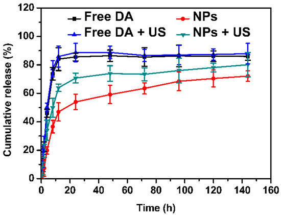 The DA release profiles of DA + US were similar to those of DA, and the total amount of drug release reached 87.9% at 144 h. When applied with US, the release rates of the DA-PLGA-PEG-cRGD NPs were more rapid than those of DA-PLGA-PEG-cRGD NPs alone, and the cumulative amount of drug released over 144 h was about 80%. The release profiles suggested that ultrasound could promote drug release from the nanocarriers and accelerate the rate of release.