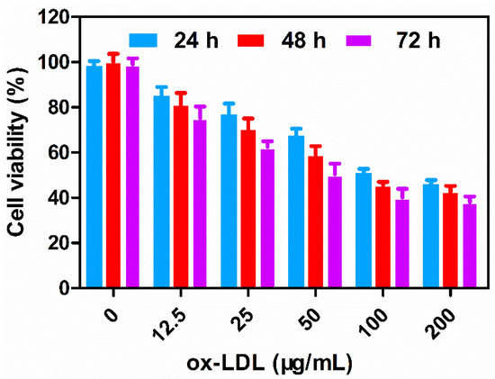 The viability of HUVECs was determined by the MTT assay. In brief, 5.0 × 105 cells were seeded in each well of a 96-well plate and incubated for 24 h at 37 °C with 5% CO2. After incubation, non-adherent cells were removed, and HUVECs were incubated with different concentrations of ox-LDL (12.5, 25, 50, 100, 200 µg/mL) for different times (24, 48, 72 h) at 37 °C with 5% CO2. Finally, the cells were incubated with 100 µL MTT (0.5 mg/mL) for 4 h at 37 °C with 5% CO2. The DMEM medium was removed, and formazan crystals were subsequently dissolved in 150 µL DMSO. The absorbance of the solution was measured at 490 nm.