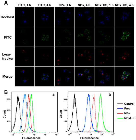 Cellular uptake of the drug in damaged HUVEC cells. (A) Confocal microscopy images of intracellular FITC distribution in damaged HUVEC cells after FITC, FITC@DA-PLGA-PEG-cRGD NPs and FITC@DA-PLGA-PEG-cRGD NPs + US treatment for 1 and 4 h. FITC (green) was used as a fluorescent probe; the cell nuclei were stained with Hochest 33342 (blue), and the cell lysosomes were stained with Lyso-Tracker (red). Original magnification, 200×; (B) Flow cytometry analyses of damaged HUVEC cells incubated with FITC, FITC@DA-PLGA-PEG-cRGD NPs and FITC@DA-PLGA-PEG-cRGD NPs + US for 1 h (a) and 4 h (b).
