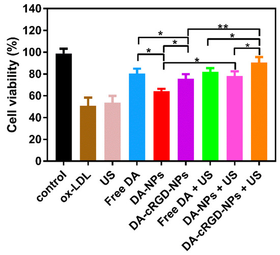 To evaluate the therapeutic effect of targeted nanoparticles combined with US, we determined the HUVEC viability through an MTT assay. In addition, DA-PLGA-PEG NPs (Figure S2) were prepared for comparison with DA-cRGD-NPs in order to demonstrate the targeting function obtained through the conjugation of cRGD.