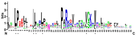 WebLogo based on the alignments of the F-box motifs from 509 F-box proteins in soybean. The overall height of each stack represents the sequence conservation at the given position of the F-box motif, whereas the height of the letters within each stack indicates the relative frequency of the corresponding amino acid. The bit score represents the information content for each position. Asterisks indicate the conserved residues.