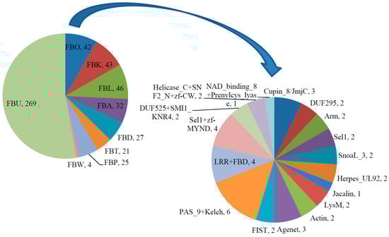 Classification of F-box proteins in soybean based on C-terminal domains. The F-box proteins were classified into nine subfamilies according to their C-terminal domains. FBU: F-box proteins with unknown C-terminal domains; FBL: those with C-terminal leucine-rich repeats (LRR) domains; FBK: those with C-terminal Kelch domains; FBA: those with C-terminal F-box-associated domains; FBD: those with C-terminal F-box domains; FBT: those with C-terminal tubby (TUB) domains; FBP: those with phloem protein 2 (PP2) domains; FBW: those with WD40 domains; FBO: those with other known domains or with more than one C-terminal domains. The composition of the FBO subfamily is further expanded and represented by the second pie chart. The number after the comma represents the number of F-box proteins in that group. NAD: nicotinamide adenine dinucleotide; DUF295: domain of unknown functions 295; FIST: F-box and intracellular signal transduction; PAS_9: Per-ARNT-Sim 9; LysM: Lys motif; Arm: armadillo repeats; Herpes_UL: herpes virus long unique region; zf-MYND: MYND type zinc finger; MYND: myeloid, Nervy, and DEAF-1, deformed epidermal autoregulatory factor 1; SnoaL: nogalonic acid methyl ester cyclase from S. nogalater. SNF2_N: SNF2 family N-terminal domain; Prenylcys_lyase: prenylcysteine lyase.