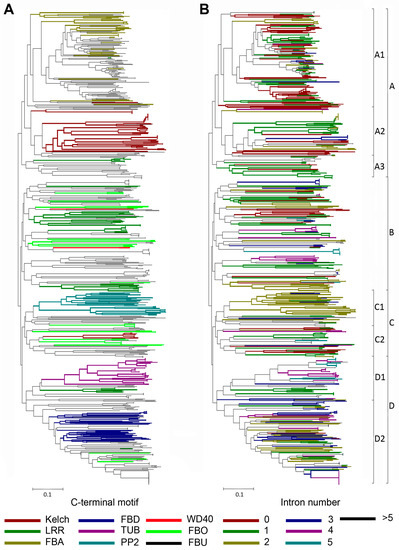 Previous phylogenetic studies on plant F-box proteins using only the F-box motifs for alignment showed that the F-box proteins with the same C-terminal domains tended to cluster in the same clades of the phylogenetic tree, and the intron–exon organization was conserved within the same clade [10,11,12,13,15,39]. Here, we aligned the 725 soybean F-box proteins using the F-box motifs, to determine the phylogenetic relationships among them. In the case of GmFBX505, which contains two F-box motifs, the sequence of the N-terminal motif was employed in the alignment. A phylogenetic tree was created using the neighbor-joining method (Figure 3). Based on the node statistics and the branch lengths, the 725 soybean F-box proteins were tentatively assigned to four groups designated from A–D, which were further divided into eight subgroups. Group A was divided into 3 subgroups, Group C into 2, and Group D into 2. The color-coded phylogenetic tree based on the C-terminal conserved domains showed that the F-box proteins with identical domains also cluster together using the traditional F-box domain alignments, supporting our way of classification based on the C-terminal domains in soybean (Figure 3A).