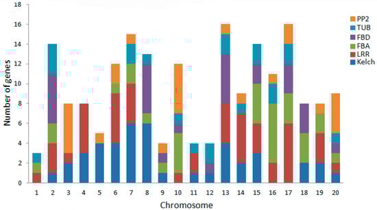 Chromosomal distributions of GmFBXs with different conserved C-terminal domain types in soybean. The different C-terminal domains (Kelch, LRR, FBA, FBD, TUB, PP2) are represented by the corresponding colors. LRR: leucine-rich repeat; FBA: F-box associated domain; FBD: F-box domain; TUB: tubby; PP2: phloem protein 2.