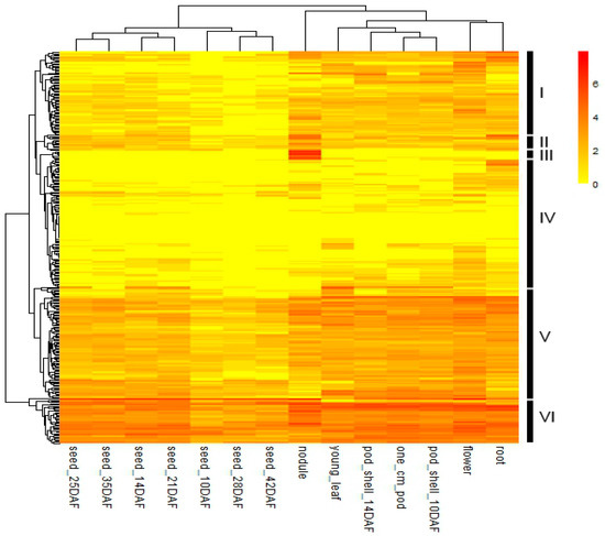 Gene expression patterns can provide crucial indications for gene functions. Some high-throughput next-generation sequencing analyses on gene expression have been performed on various soybean tissues [38,44]. To investigate the tissue-specific expressions of GmFBXs, the publicly available RNA-seq data were downloaded from Soybase [45]. It contains samples from 14 tissue types. The transcript patterns of 375 F-box genes were retrieved in terms of normalized Reads/Kb/Million (RPKM) values, and among them 317 genes were expressed in at least one of the 14 tissues. Those F-box genes which were missing in the dataset could be either pseudogenes or were only expressed under particular conditions or at specific developmental stages. A heat map of the differential transcript abundance of these 317 F-box genes in the 14 tissue types shows that most F-box genes have broad expression patterns in soybean (Figure 6). Many F-box genes (194 out of 317) were constitutively expressed in all 14 tissue types. Among them, 18 F-box genes were highly expressed, with a normalized RPKM value of higher than 4. F-box genes could be involved in multiple developmental processes in soybean. According to the hierarchical clustering tree based on their specific expression patterns in different tissues, GmFBXs could be divided into six groups (I–VI) (Figure 6). The expression levels of the Group I genes were lower during the seed development stage compared to the others. The genes of the Group II and III have a higher expression level in nodules. Interestingly, the 8 F-box genes of Group III were highly expressed particularly in nodules, suggesting their putative roles in nodulation. Compared with the other groups, the F-box genes in Group IV shared a low expression level and those in Group V showed a medium expression level throughout the entire plant, whereas the expression levels of those in Group VI were relatively high in most of the examined tissues.