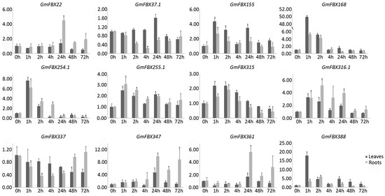 Relative expression levels of 12 GmFBXs in response to salt stress. RNA was extracted from the leaves and roots of soybean at 0 h, 1 h, 2 h, 4 h, 24 h, 48 h and 72 h after a 0.9% NaCl treatment. The quantitative reverse-transcription polymerase chain reaction (qRT-PCR) data were normalized with GmELF1b and the gene expression levels relative to those at 0 h were shown. The error bars indicate standard deviations (t-test, * p < 0.05).