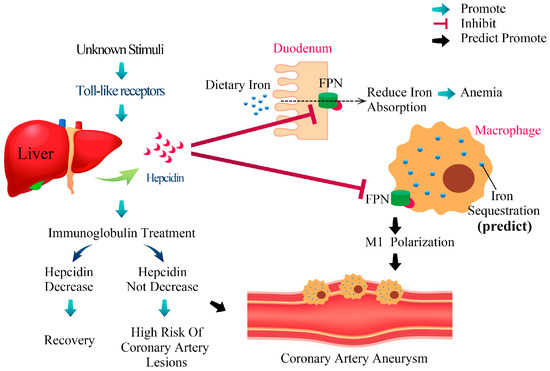 Inflammation-induced hepcidin can induce transient hyposideremia, anemia, and disease outcomes in acute-phase KD (Figure 1), and further insightful research is required to better clarify the role of hepcidin in the pathogenesis of KD.