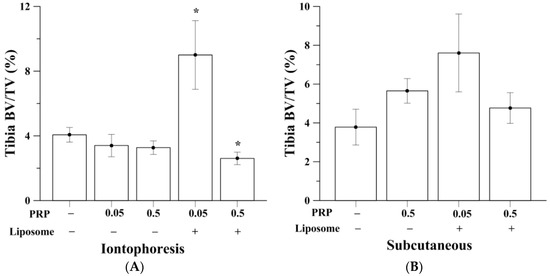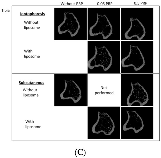 (A) Low-dose liposomal PRP (0.05 mg/kg) given by iontophoresis (n = 13) approximately doubled bone volume (BV)/total tissue volume (TV) percentage in tibia (* p < 0.05); (B) Subcutaneous injection of pure or liposomal PRP (n = 8) did not show significant effects on tibia BV/TV; (C) The micro-computed tomography (micro-CT) reconstructed images were in consistency with the BV/TV values of proximal tibia of the rat acquired in each experimental group.