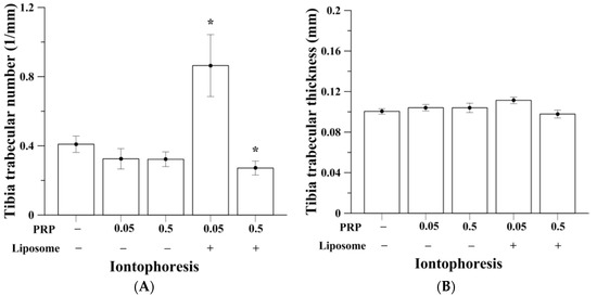(A) Liposomal PRP at 0.05 mg/kg given via iontophoresis (n = 13) approximately doubled tibia trabecular number (* p < 0.05) and (B) slightly increased tibia trabecular number.