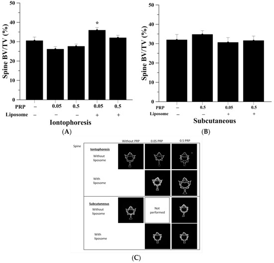 (A) Low-dose liposomal PRP (0.05 mg/kg) given by iontophoresis (n = 13) enhanced BV/TV in spine (* p < 0.05); (B) Subcutaneous injection PRP of pure or liposomal forms (n = 8) did not have significant effects on spinal BV/TV; (C) The micro-CT reconstructed images were in consistency with the BV/TV values of proximal tibia of the rat acquired in each experimental group.