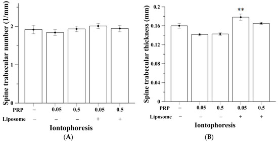 (A) Liposomal PRP (0.05 mg/kg) given by iontophoresis (n = 13) mildly increased spinal trabecular number; (B) Iontophoretic liposomes-encapsulated PRP (0.05 mg/kg) significantly increased spinal trabecular thickness (n = 13, ** p < 0.01).