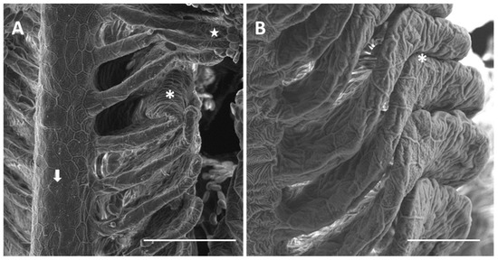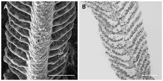 Each gill is supported by four branchial arches which provide insertion to a double series of filaments (i.e., primary filaments or main filaments). From each filament departs a double series of secondary lamellae (i.e., secondary filaments) characterized by a large flattened surface (Figure 1A,B).