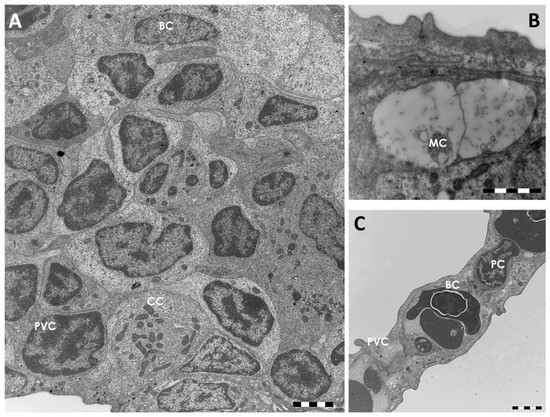 The MCs are easily identifiable by their roundish shape and by the presence of numerous electron clear granules that filled the entire cytoplasm (Figure 2B). The CCs are large round or ovoid cells characterized by numerous mitochondria and by a complex tubulo-vesicular system in their cytoplasm (Figure 2A). The secondary epithelium is very simple and it is composed by an external layer of PVCs and an inner layer of basal cells (Figure 2C). The pillar cells that regulate capillary blood flow and endothelial cells are easily recognizable (Figure 2C).