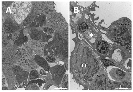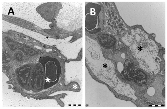 TEM micrographs of the gill apparatus in D. rerio after 96 h of exposure to 38.5 µg/L of HgCl2: (A) high magnification of long processes in PVCs (asterisks) and edema formation in the distal portion of lamellae (star); (B) degenerated and apoptotic PVCs (asterisks) with the disappearance of PCs. All bars 2 µm.