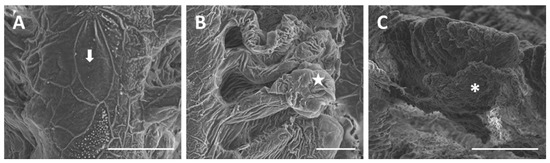 Gill alterations in D. rerio are more conspicuous after 96 h of exposure to 38.5 µg/L of HgCl2 (we will refer to 38.5 µg/L as the “high” concentration). SEM observations on the main filament show that the microridges of PVCs completely lose their typical arrangement and, in some cases, disappear (Figure 6A). The epithelial surface, of both filaments and lamellae, appears wrinkled and almost all the secondary lamellae show an intense swelling in their distal portion (Figure 6B). At this concentration it is also relevant that the presence of a strong mucous blanket covers the entire gill apparatus (Figure 6C).