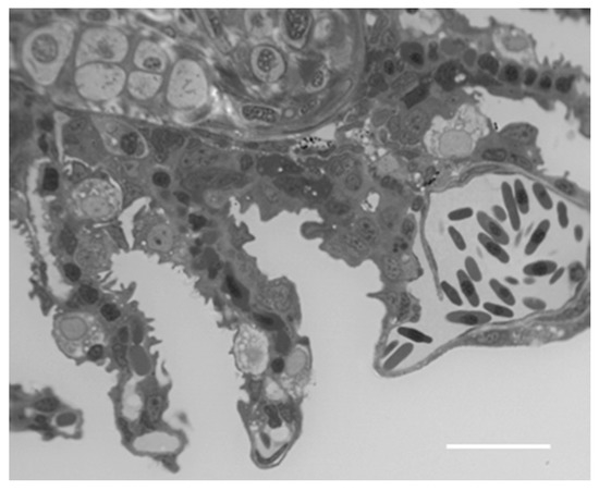 Under TEM, the profound degeneration of the gill apparatus is more evident. The epithelium of primary filaments is altered by the numerous intercellular gaps and by the massive degeneration of mucous cells; macrophage infiltrations are also frequently observed (Figure 8A).