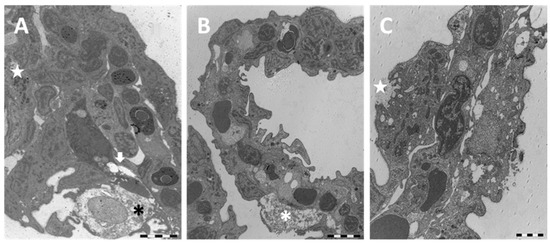 TEM micrographs of the gill apparatus in D. rerio after 96 h of exposure to 38.5 µg/L of HgCl2: (A) degeneration in primary epithelium with degeneration of mucous cells (asterisk), epithelial gaps (arrow), and macrophage infiltrations (star); (B) folding of secondary lamellae, hypertrophic mucous cell (asterisk), and tissue hyperplasia; (C) appearance of CCs in secondary lamellae and formation of deep invagination in CC (star). All bars 2 µm.