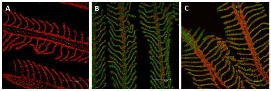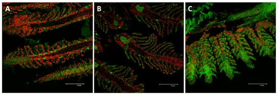 Confocal micrographs of the D. rerio gill apparatus. Sections labeled with a mouse monoclonal antibody against metallothionein (MT) (green–Fluorescein Isothiocyanate (FITC) labeled); nuclei labeled with propidium iodide (red); (A) no MTs expression in the gills of the control group; (B) after 96 h of exposure to 7.7 µg/L of HgCl2, MTs immunoreactivity strongly appear in both the primary and secondary epithelium; (C) after 96 h of exposure to 38.5 µg/L of HgCl2, the intensity of staining lightly decrease compared to the basal condition in both the filament and lamellar epithelium. All bars 75 µm.