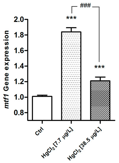 The effects of HgCl2 exposure on the expression levels of the target gene (mtf1 and atp1a1a.1) were performed using Graph Pad Prism 5.00 (GraphPad Software Inc., San Diego, CA, USA) at a significance level of 0.05. The effects of mercury contamination were compared using one-way analysis of variance (one-way ANOVA), followed by Bonferroni’s Multiple Comparison Test.