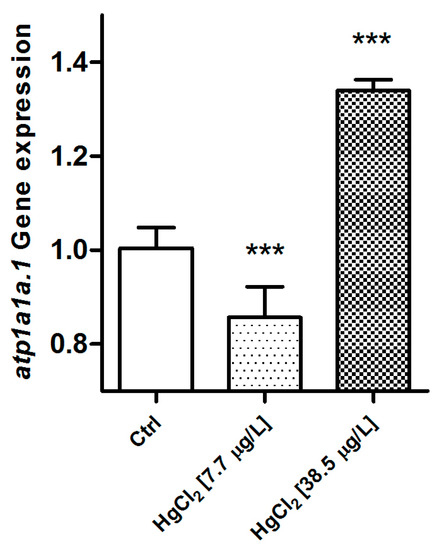 Also in this case, the genetic analysis reveals a significant modification after exposure to HgCl2. The gene expression level of atp1a1a.1 is significantly down-regulated in the samples from the low concentration group when compared to the control group (p < 0.001). On the contrary, after exposure to the high concentration of HgCl2, the atp1a1a.1 gene is significantly up-regulated compared to the basal condition (p < 0.001) (Figure 13). In the D. rerio gill apparatus, for both reference genes, no change has been reported after mercury exposure.