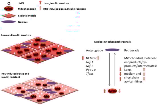 Mitochondrial adaptations, such as alterations in number and function, are determined through coordinated communication that occurs between the nucleus and mitochondria. This communication or nucleo-mitochondrial crosstalk is a two-way process involving anterograde communication from the nucleus to the mitochondria and retrograde communication from the mitochondria to the nucleus (right). The expression of several nuclear-encoded mitochondrial genes (NEMGs) are known to regulate skeletal muscle mitochondrial number and function, including Nrf-1, Nrf-2, Pgc-1α and Tfam and contribute to anterograde communication. Alternatively, mitochondrial protein or metabolic products are known to play a role in retrograde communication to determine NEMG expression. We propose that mitochondrial beta oxidation intermediates, by-products and products, such as long, medium and short acylcarnitines, may act as part of this retrograde communication. Interestingly, in response to high fat diet (HFD) feeding and during obesity and insulin resistance, a downregulation in NEMG expression is seen. Alterations in acylcarnitine profiles suggesting incomplete beta oxidation with accumulation of long and medium chain acylcarnitines with respect to short chain acylcarnitines (arrows represent ratios of skeletal muscle acylcarnitines in comparison between lean, insulin sensitive, and obese, insulin resistant states) and decreased mitochondrial number and function. These alterations may contribute to increased intramyocellular lipid (IMCL) accumulation and insulin resistance during HFD-induced obesity (left).