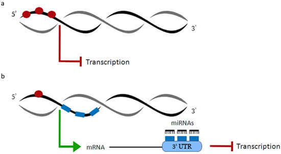Functional complementation between methylation of promoter regions and miRNA post-transcriptional regulation. DNA methylation of promoter regions (a) and miRNA regulation (b) are usually mutually exclusive. Red dots: promoter methylated sites; blue rectangles: miRNA binding sites.