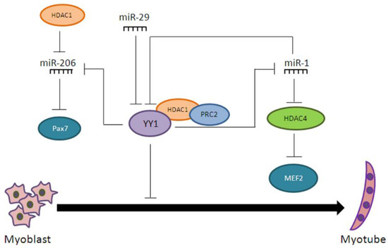 The interplay between miRNAs and HATs/HDACs, as well as the coordinated actions of the two epigenetic mechanisms, play a paramount role in myogenesis, especially during muscle development. One of the miRNAs involved in myogenesis is miR-1, which promotes muscle regeneration also by targeting HDAC4 [78] that, in turn, inhibits the expression of the myogenic factor Myocyte enhancer factor 2 (MEF2) [79]. Similarly, miR-29 promotes myogenesis through the inhibition of the transcriptional regulator Ying Yang 1 (YY1), which, in conjunction with the epigenetic factors PRC2 and HDAC1, acts as a repressor of muscle-specific gene expression [80]. Interestingly, YY1 is also a target of miR-1 and represses the expression of miR-1, miR-133, and miR-206 in myoblast, by recruiting PRC2 on their promoters [81]. miR-206 promotes myoblast differentiation by repressing Pax7 [78], and its expression is strictly controlled by HDAC1 during myogenesis [82]. Thus, miRNAs regulate the expression of HDACs and other chromatin remodeling factors, creating regulatory circuitries that supervise and reinforce the epigenetic regulation of gene expression in myogenesis (Figure 2).