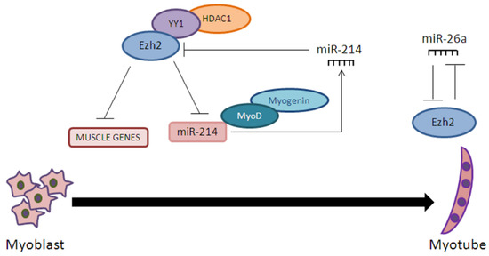 The role of microRNAs and histone methylation during myogenesis has been extensively studied in recent years. Various miRNAs modulate chromatin structure and gene transcription by regulating histone methylation. In a study in which the expression of miRNAs from proliferating myoblasts to terminally-differentiated myotubes was analyzed, miR-26a was identified as upregulated during myogenesis [79]. By using a bioinformatics approach, a subunit of PRC2 complex, Ezh2, was identified as a possible miR-26a target gene. Coherently, the expression of miR-26a and Ezh2 inversely correlated during muscle differentiation. Prior to myogenesis, the histone methyltransferase Ezh2, along with YY1 and HDAC1, bound to the E-box regions of muscle-specific gene promoters, causing their silencing primarily through H3K27 three-methylation. Upon activation of myogenesis, the Ezh2-containing complex disassociated from chromatin, maintaining the accessibility of the promoter regions to transcriptional activators. Therefore, an increased level of miR-26a during myogenesis serves to post-transcriptionally repress Ezh2 so that it is no longer able to elicit its suppressive effects on myogenesis [91] (Figure 3). However, this study does not clarify the mechanism completely. It is still unclear whether miR-26a-mediated Ezh2 mRNA suppression causes the decrease in Ezh2 protein expression observed during myogenesis or whether the decline in Ezh2 protein acts as a negative feedback, causing the decrease in Ezh2 mRNA expression. In addition to miR-26a, the Ezh2 3′ UTR is also targeted by miR-214 [92]. It is likely that miR-214 and miR-26a repress Ezh2 at distinct developmental steps. Both miR26a and miR-214 affect Ezh2 and, in turn, they are modulated by Ezh2 in a negative feedback loop. While miR-26a may be relevant at later stages of differentiation, as its expression occurs in terminally-differentiated muscle cells, miR-214 accumulation is observed at the very initial stages of cell differentiation. A working model in which the downregulation of Ezh2, taking place at the initial phase of muscle differentiation, together with MyoD and/or myogenin recruitment, promotes the expression of miR-214 has been proposed (Figure 3). While in myoblasts, PRC2 binds and represses miR-214 transcription, during differentiation, PRC2 is disengaged and MyoD/myogenin are recruited at the miR-214 promoter region, promoting its transcription. After being transcribed, miR-214 loops back to target the Ezh2 3′ UTR, thus reducing Ezh2 protein accumulation.