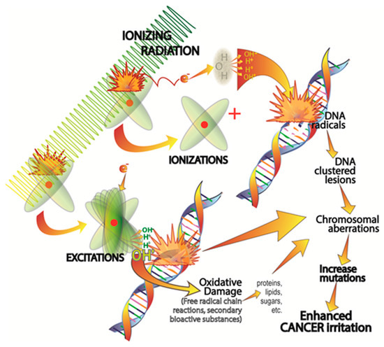 A major contributor to cancer development is ionizing radiation [42]. With regard to oncogenesis, the biological consequences of ionizing radiation are initially experienced at the genomic level when DNA absorbs energy. Such ionizing radiation occurs normally in nature and has been developed for therapies and other reasons. During ionizing radiation exposure, high energy photons or electrons are absorbed by DNA causing excitations or ionization with the latter being more likely to lead to mutations and tumor initiation (Figure 1) [43]. The ionization of molecules generates molecular species referred to as free radicals or reactive oxygen species (ROS) or nitrogen species (RNS) which often contain unpaired electrons making them highly reactive and damaging [44]. Free radicals/reactive species produced in the immediate vicinity of DNA induce its ionization which changes its biological functions. The damage resulting from exposure to ionizing radiation is referred to as its direct effect; if the damage goes unrepaired, the DNA may mutate [43]. In addition to the direct effects, the radiolytic products resulting from ionizing radiation exposure can cause molecular damage and serious physiological disruption. These are referred to as the indirect effects of ionizing radiation.