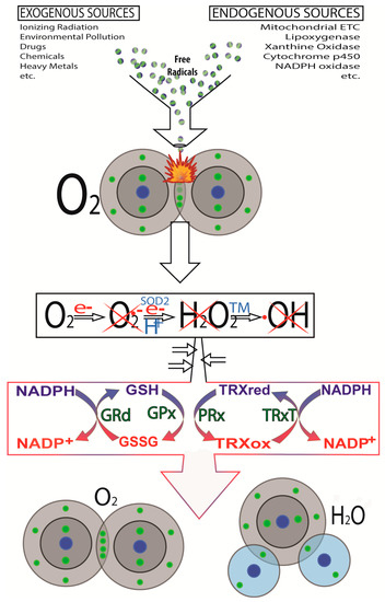 In addition to ionizing radiation, a host of other exogenous and endogenous factors contribute to genetic damage that may be a precursor to cancer initiation. As with ionizing radiation, these factors commonly induce injury by promoting the excessive generation of highly-destructive partially reduced oxygen species, i.e., ROS [100]. Some exogenous contributors to cellular DNA damage include environmental pollutants [101,102], exposure to heavy metals [103,104], toxic drugs [105,106], chemicals [107,108] (Figure 2), etc. Intracellularly, endogenous processes may also cause ROS production to the extent that it exceeds the capacity of the antioxidant defense network to fend off the damage associated with these oxygen metabolites. Most notably, misguided election flux between the respiratory complexes of the inner mitochondrial membrane causes the electrons to be misdirected allowing them to chemically reduce nearby ground state oxygen molecules to generate the O2•− [109,110,111,112]. This occurs especially at complexes I and III. Similarly, metabolic activity, especially during enzymatic processes, cause the production of damaging ROS (Figure 2) [113]. ROS/RNS are obviously involved in the molecular damage that precedes a mutation and cancer initiation. While it is well substantiated that reactive species directly attack and damage the genome, other partially reduced species, e.g., hydroxynonenal, a product of lipid peroxidation, also has carcinogenic potential [114]. Thus, any agent or process that limits their formation or quickly neutralizes ROS/RNS would likewise lessen cancer incidence. These actions come into play especially in mitochondria since they are a major site of free radical generation.