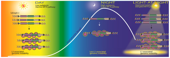 The findings of de Haro et al. [128] directly relate to this and document the important role of melatonin in influencing the expression of L1, which is commonly upregulated in human cancers. As stated above, L1 promotes genomic instability by causing double strand breaks and via insertional mutagenesis. Melatonin, by a process that requires its interaction with the MT1 membrane melatonin receptor, reduces the mobility of L1 in cultured cancer cells by downregulating L1 mRNA and the ORF1 protein. Importantly, this group also observed that melatonin-rich blood, collected from individuals at night, inhibited L1 mRNA in human cancer xenografts. Conversely, melatonin-poor blood, which was collected from individuals exposed to light at night, had no effect on L1 mRNA or ORF1 protein. From this, the group inferred that any process that reduces nighttime melatonin levels, e.g., light pollution or advanced age, would likewise enhance the likelihood of L1 expression and DNA damage (Figure 3). For additional details on the processes by which retrotransposons impact genomic stability the readers are encouraged to see reviews by Belancio et al. [129,130].