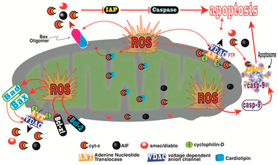 There are a number of means by which ROS compromise tumor cell survival. O2•− triggers the rapid release of cytochrome c from the mitochondria which contributes to the series of processes that mediate apoptosis of cancer cells; this involves a VDAC-dependent permeabilization of the mitochondria (Figure 4) [167]. In mitochondria, cytochrome c is normally complexed with cardiolipin; this complex must be breached to allow the translocation of cytochrome c into the cytosol. In the presence of H2O2, cardiolipin is oxidized thereby disassociating from cytochrome c allowing the latter to move out of the mitochondria where it continues the process of apoptosis.