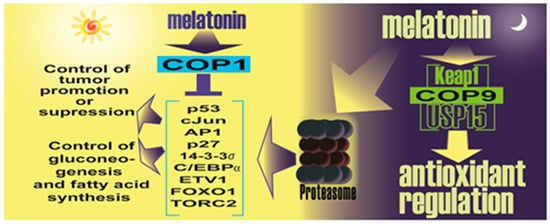 The theory relating to melatonin and the proteasome system being involved in the anticancer actions of melatonin has recently been expanded to include a likely action on constitutive morphogenesis protein 1 (COP1) [217]. This theory also provides a context for melatonin’s antioxidant actions due to its potential interactions with the super complex formed by COP9, the oxidative stress sensor Keap1 and the deubiquitinase USP15 [217] (Figure 5).