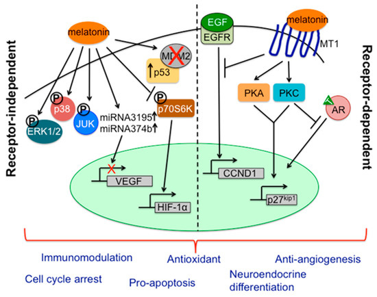 The wide spectrum of biological effects elicited by melatonin underscores the diverse mechanisms of its action to counteract prostate cancer progression. It is now generally accepted that melatonin exerts its anticancer function either through an interaction with its specific receptors or in a receptor-independent manner. Two forms of protein receptors (MT1 and MT2) have been identified in humans, with different binding affinity for melatonin. They are both G-protein-coupled receptors and promote a cascade of downstream signaling upon an interaction with the indole.