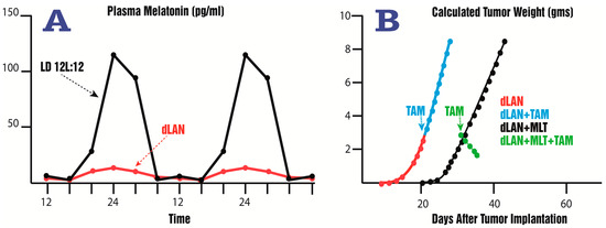 In 2004, Blask and coworkers [17] published a seminal report which confirmed that nocturnal human blood melatonin levels are adequate to force the shutdown of human breast cancer xenografts growing in immunosuppressed rats. They perfused the tumors growing under these conditions with either daytime human blood (containing low melatonin levels) or with nighttime blood (containing elevated melatonin levels) and observed that daytime blood samples had no measureable effect on the metabolism of xenografts. In contrast, their perfusion with nighttime blood inhibited cAMP levels, linoleic acid (a growth factor for the tumors) uptake and its conversion to 13-hydroxy-octadecadienoic acid (13-HODE), a mitogenic stimulus for the tumors. Even more interestingly, if the blood donors were exposed to light at night which only partially suppressed high nocturnal blood levels (by about one-third), when perfused into the breast cancer xenografts, those samples were incapable of repressing tumor metabolism [17]. That melatonin was the molecule in the blood that was responsible for cancer inhibition was substantiated when the effects on the tumors were blocked by the use of an MT1/MT2 melatonin receptor antagonist. Moreover, adding supplemental melatonin to blood samples containing partially suppressed melatonin values restored their ability to inhibit the metabolism of the cancer transplants.