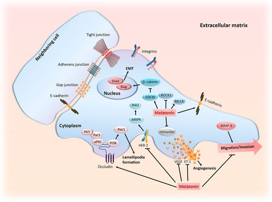 - Su, S.C.; Hsieh, M.J.; Yang, W.E.; Chung, W.H.; Reiter, R.J.; Yang, S.F. Cancer metastasis: Mechanisms of inhibition by melatonin. J. Pineal Res. 2017, 62, e12370. [Google Scholar] [CrossRef] [PubMed]