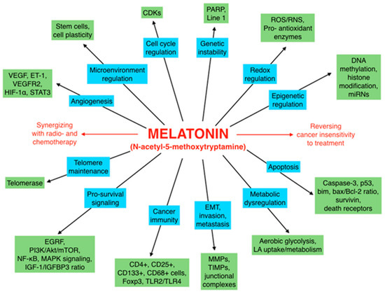 In 2004, a brief commentary was published related to the then-explored mechanisms by which melatonin modulates cancer initiation and progression [1]. In that summary, several processes by which melatonin may protect against cancer risk were acknowledged. The first of these related to cancer initiation where melatonin, because of its radical scavenging actions [2,3,4,5,6], prevents damage to nuclear DNA [7,8,9,10] that results when it encounters reactive oxygen or nitrogen species [11,12,13]. DNA mutilated by any means can undergo mutation and proceed to cancer [14,15]; such damage persistently occurs, and if it goes unrepaired, it continues to accumulate throughout a life time and is likely a primary cause of cancer in the elderly [16].