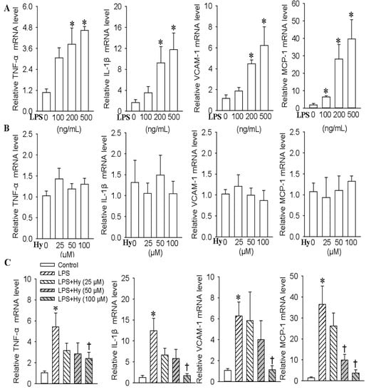 2.1. Effects of Hy on the Expressions of TNF-α, IL-1β, VCAM-1 and MCP-1 in HMEC-1 Cells Response to LPS