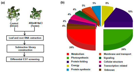 Experimental scheme of screening differentially expressed genes by suppression subtractive hybridization (SSH) and functional classification of the identified genes using the UniProt database. (a) Experimental scheme; (b) Functional classification of the differential genes; EST stands for expressed sequence tag.