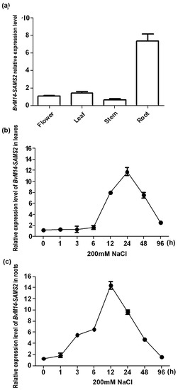 The responses of BvM14-SAMS2 mRNA to salt stress were determined in roots and leaves using quantitative reverse transcription-polymerase chain reaction (RT-PCR). The induction of BvM14-SAMS2 transcript was found much earlier in roots than in leaves (Figure 2b,c). High levels of BvM14-SAMS2 transcripts were observed at 12 h and 24 h after salt treatment in roots and leaves, respectively (Figure 2b,c). These results showed that the expression of BvM14-SAMS2 was significantly up-regulated by salt stress.
