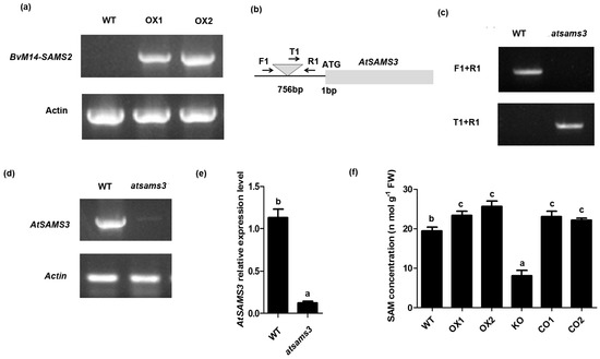 To determine the functions of BvM14-SAMS2 under salt stress conditions, we created transgenic Arabidopsis plants that over-express the BvM14-SAMS2 gene. Two homozygous T3 overexpressed BvM14-SAMS2 transgenic lines (OX1 and OX2) were identified by RT-PCR analysis (Figure 3a). Furthermore, the T-DNA insertion mutant line of atsam3 from Arabidopsis was identified (Figure 3b–d). The T-DNA was inserted in the upstream region of the AtSAMS3 promoter (at 765 bp) (Figure 3b,c) and the expression level of AtSAMS3 was significantly decreased in the atsam3 mutant (Figure 3d,e). In addition, the construct overexpressing BvM14-SAMS2 was also transformed into the atsam3 mutant background and two homozygous T3 complementation lines (CO1 and CO2) were selected. Furthermore, the content of SAM was also detected in different Arabidopsis seedlings (Figure 3e). The BvM14-SAMS2-overexpressed transgenic lines showed higher levels of SAM than the wild type (WT), and AtSAMS3 konckdown mutant (KO) line exhibited much lower SAM levels than WT.