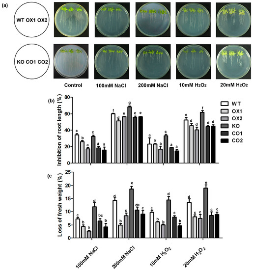 Analysis of salt and H2O2 tolerance in transgenic Arabidopsis plants in comparison with the wild type and atsams3 mutant. (a) Phenotypes of wild type (WT), BvM14-SAMS2 BvM14-SAMS2-overexpressed seedlings in wild type Arabidopsis (OX), atsams3 mutant (KO), and BvM14-SAMS2 in mutant complementation seedlings (CO) under control and stress conditions. Photographs were taken 14 days after treatment. Inhibition of root length (b); and loss of fresh weight (c) were determined. Data are the means of three biological replicates (SD) and each replicate contains five seedlings. Different letters indicate significant difference at p < 0.05.