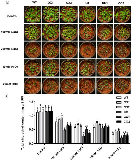 The BvM14-SAMS2 characterized in this study was salt-stress induced in roots and leaves of the sugar beet M14 line. Our results are consistent with previous findings of the induction of SAMS expression by salt, cold, drought and H2O2 [28,29,30]. Furthermore, overexpression of BvM14-SAMS2 in Arabidopsis led to significant increases in salt and H2O2 stress tolerance (Figure 4). Photosynthesis, as the most important and complex physiological process of plants, is severely affected by many abiotic stresses. It is reported that salt stress reduced the level of photosynthetic pigments. Usually, the level of photosynthetic pigment is thought to be a biochemical indicator for evaluating salinity tolerance in plants. The KO lines showed a decrease in the total chlorophyll content compared to WT under the stress conditions (Figure 5). Therefore, the decreased chlorophyll content clearly indicates the sensitivity of the KO line to salt and H2O2 stresses.