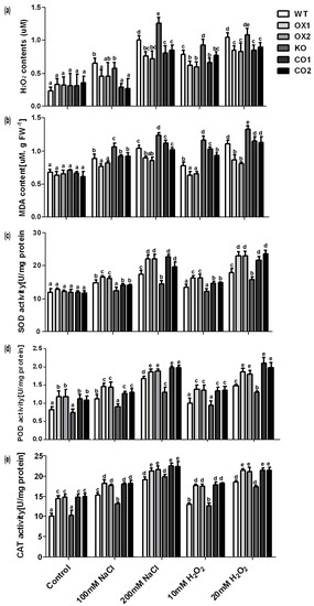 Salt stress usually causes oxidation induced lipid membrane damage. The damage can be determined by lipid peroxidation, and the malondialdehyde (MDA) content reflects the level of lipid peroxidation. Under stress conditions, all genotype seedlings exhibited the increasing trend of H2O2 and MDA contents. However, KO lines accumulated higher contents of H2O2 and MDA than WT plants or CO lines (Figure 6a,b). Furthermore, overexpressed plants showed lower H2O2 and MDA contents than wild type plants under stress conditions (Figure 6a,b). These results demonstrated that oxidative damage was reduced in the overexpressed plants. In addition, we analyzed the activities of antioxidant enzymes to determine whether the antioxidant enzyme system was involved in reducing the oxidative damage. The activities of antioxidant enzymes including superoxide dismutase (SOD), catalase (CAT) and peroxidase (POD) exhibited higher activities in the OX lines than in WT under salt and H2O2 stresses (Figure 6c–e). Although stress conditions can induce the activities of these antioxidant enzymes in all the plants, the KO lines exhibited smaller extent of increasing activities than WT under salt and H2O2 stresses (Figure 6c–e). In addition, no differences in the activity of SOD were detected under the normal conditions between all the seedlings, except that the activities of CAT and POD in the overexpressed plants were higher than WT or KO line under the control conditions.