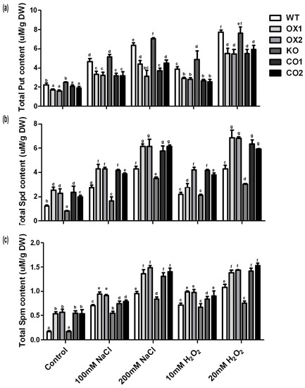Three types of polyamines, total putrescine (Put), spermidine (Spd) and spermine (Spm) were detected in the overexpressed transgenic plants and wild type. The OX lines showed lower Put concentration than the wild type under control, salt stress and H2O2 stress conditions (Figure 7a). However, under control and stress conditions, Spd and Spm increased in the OX lines (Figure 7b,c). These results showed that overexpressed BvM14-SAMS2 greatly influenced polyamine metabolism. In addition, proline contents were analyzed (Figure S4) and the results showed that there were no differences between OX lines and wild type under the control condition. Under stress conditions, proline contents increased in both transgenic plants and wild type. However, proline contents were significantly higher in OX lines than in the wild type during salt and H2O2 stresses, indicating that the wild type plants experienced higher extent of cell damage than the transgenic plants under stress conditions.